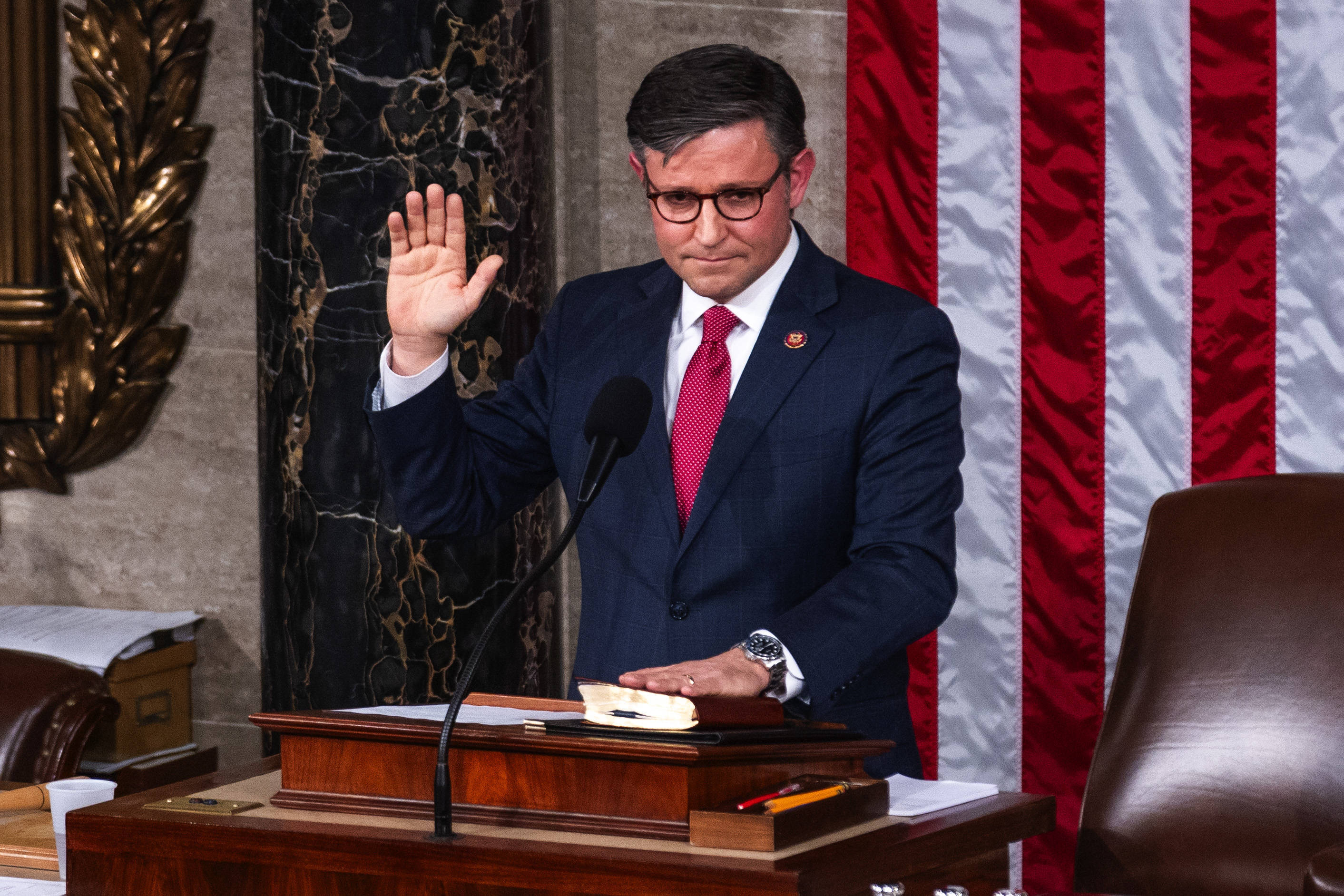 2023年10月25日,在好意思国华盛顿国会,新当选的众议院议长迈克·约翰逊宣誓赴任。新华社发(亚伦摄)特朗普对两党完毕的折中公约暗示撑执,称这份公约“特别好”。