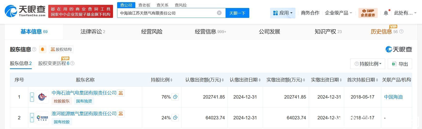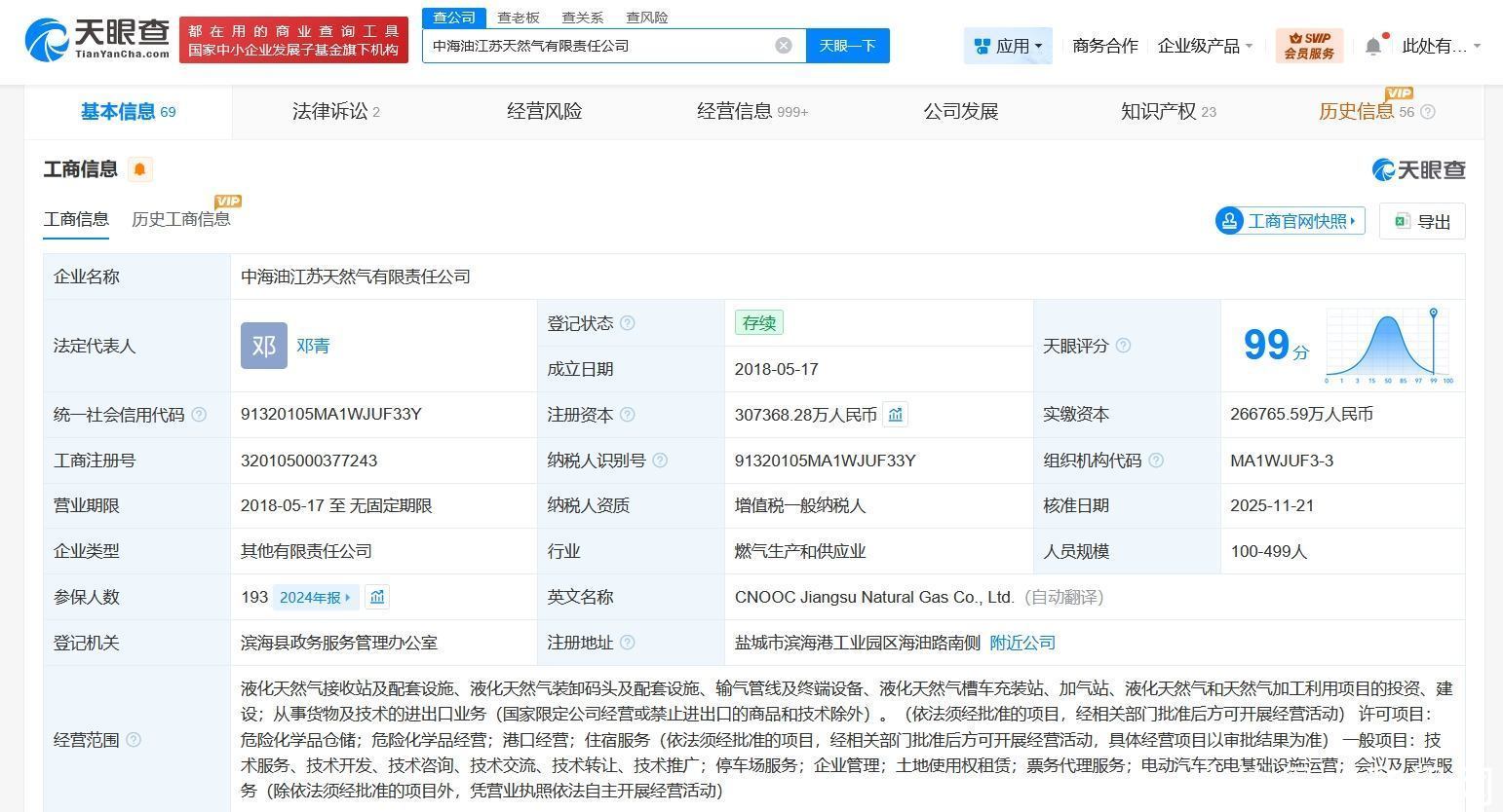 天眼查工商信息表示,近日,中海油江苏自然气有限包袱公司发生工商变更,注册成本由约26.7亿东谈主民币增至约30.7亿东谈主民币世博体育app下载,增幅约15%,同期,多位高管发生变更。