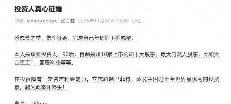 11月27日,公众号“亿万鑫”发出一篇著述《投资东谈主至心征婚》。该著述自述称,其是90后行状投资东谈主,是多家上市公司的十大鼓舞之一、最大当然东谈主鼓舞。