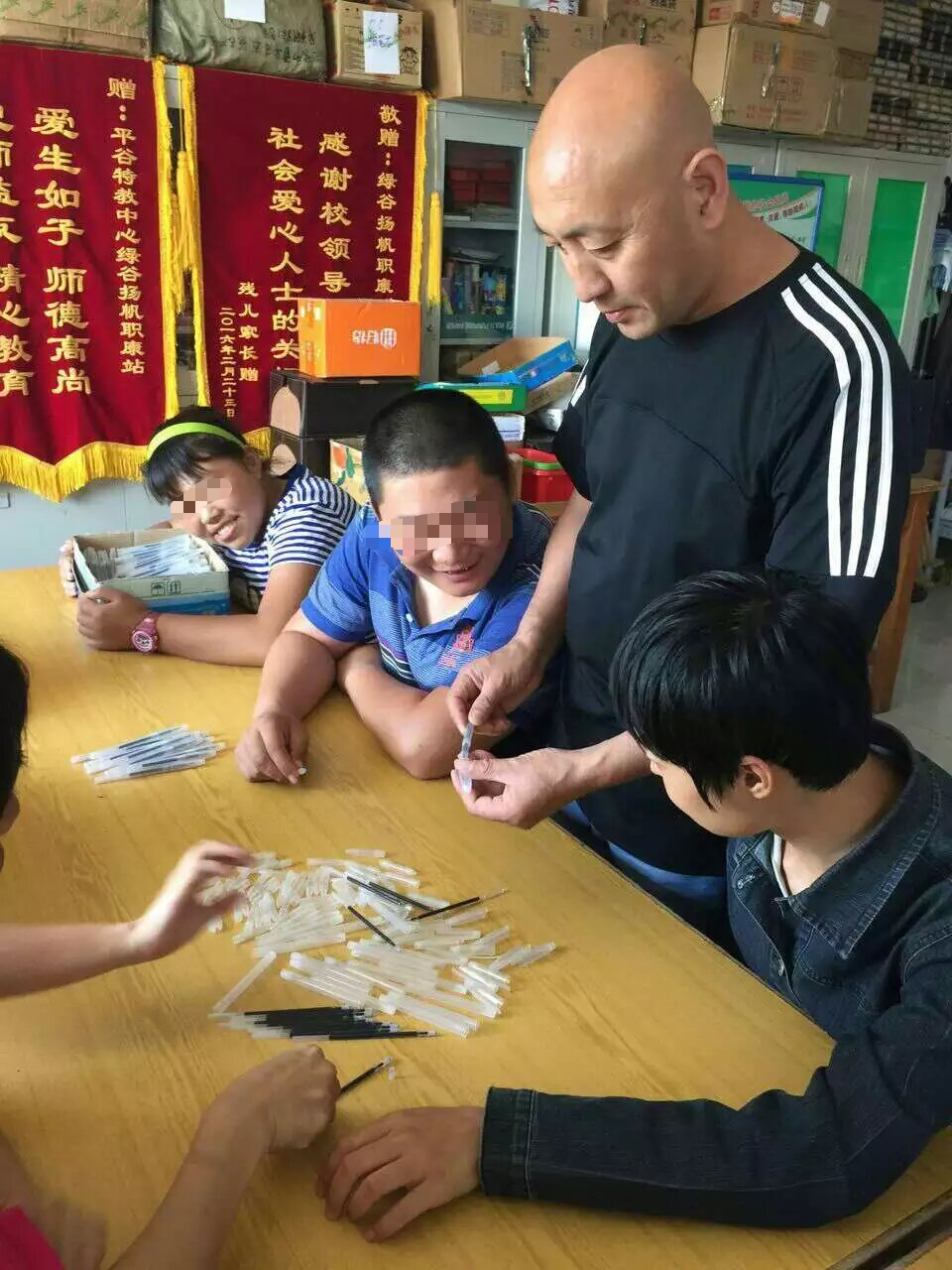 李旺带着学生们制作中性笔。受访者供图