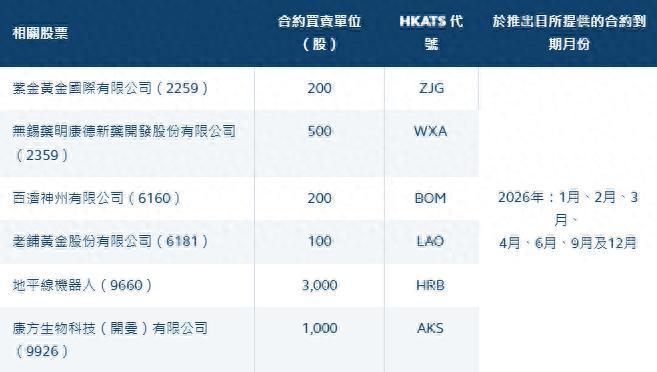 智通财经APP获悉,1月9日,香港交游所晓喻,将于2026年1月19日(星期一)推出六只新的股票期权类别,进一步拓展股票期权商场及为投资者提供更丰富的罗致。相干股票包括紫金黄金国外(02259)、药明康德(02359)、百济神州(06160)、老铺黄金(06181)、地平线机器东谈主(09660)及康方生物(09926)。