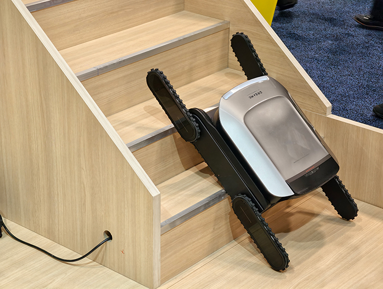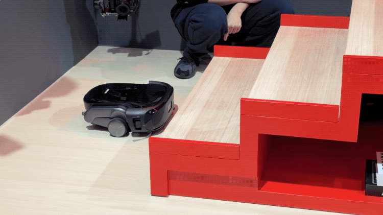 咱们还在现场看到了曾在前年IFA亮相过的爬楼机Cyber X,和上一次比较,它的性能又有了一些新升级。目前它能爬上最高35cm的台阶,挪动速率也作念到了最快0.2m/s,爬一层楼只需要27秒。它特有的三段式履带关于楼梯的稳健性很强,直梯、弧形梯等等楼梯都不错流通攀爬,可攀爬坡度也达到了42°。